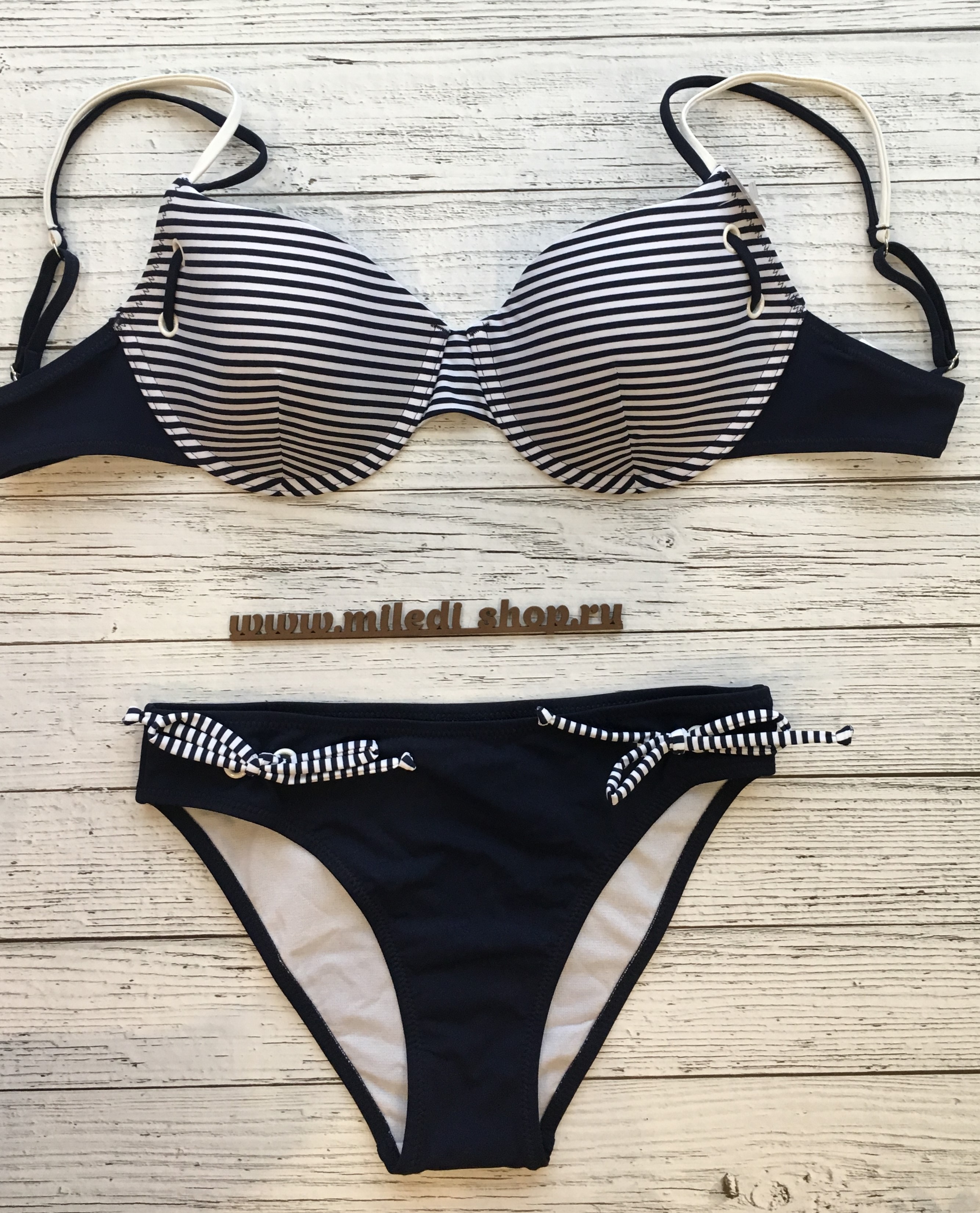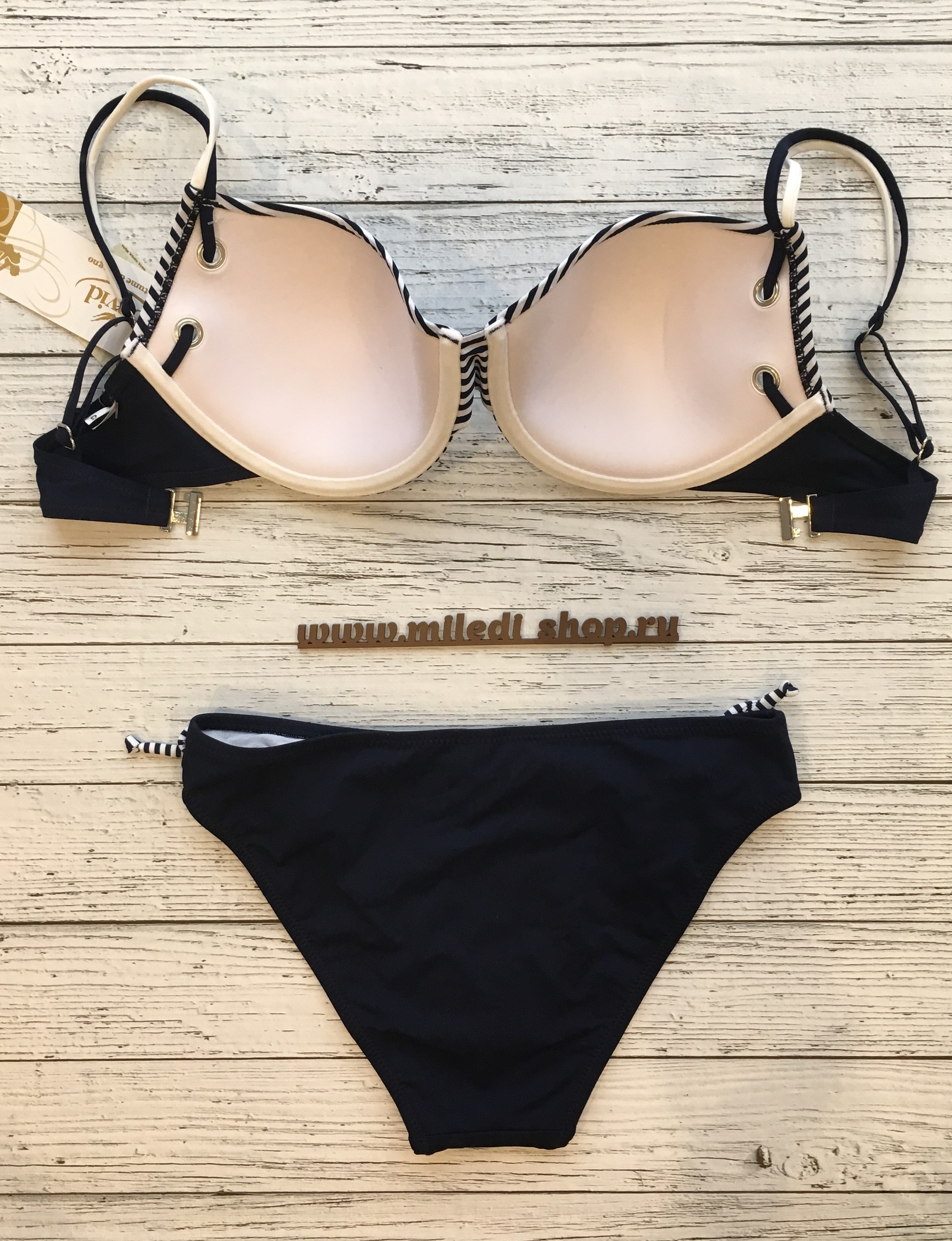 Раздельный купальник с формованной чашкой на кости, бретели регулируемые, на спине на застежке. Плавки слипы. Морской принт, шнуровка.