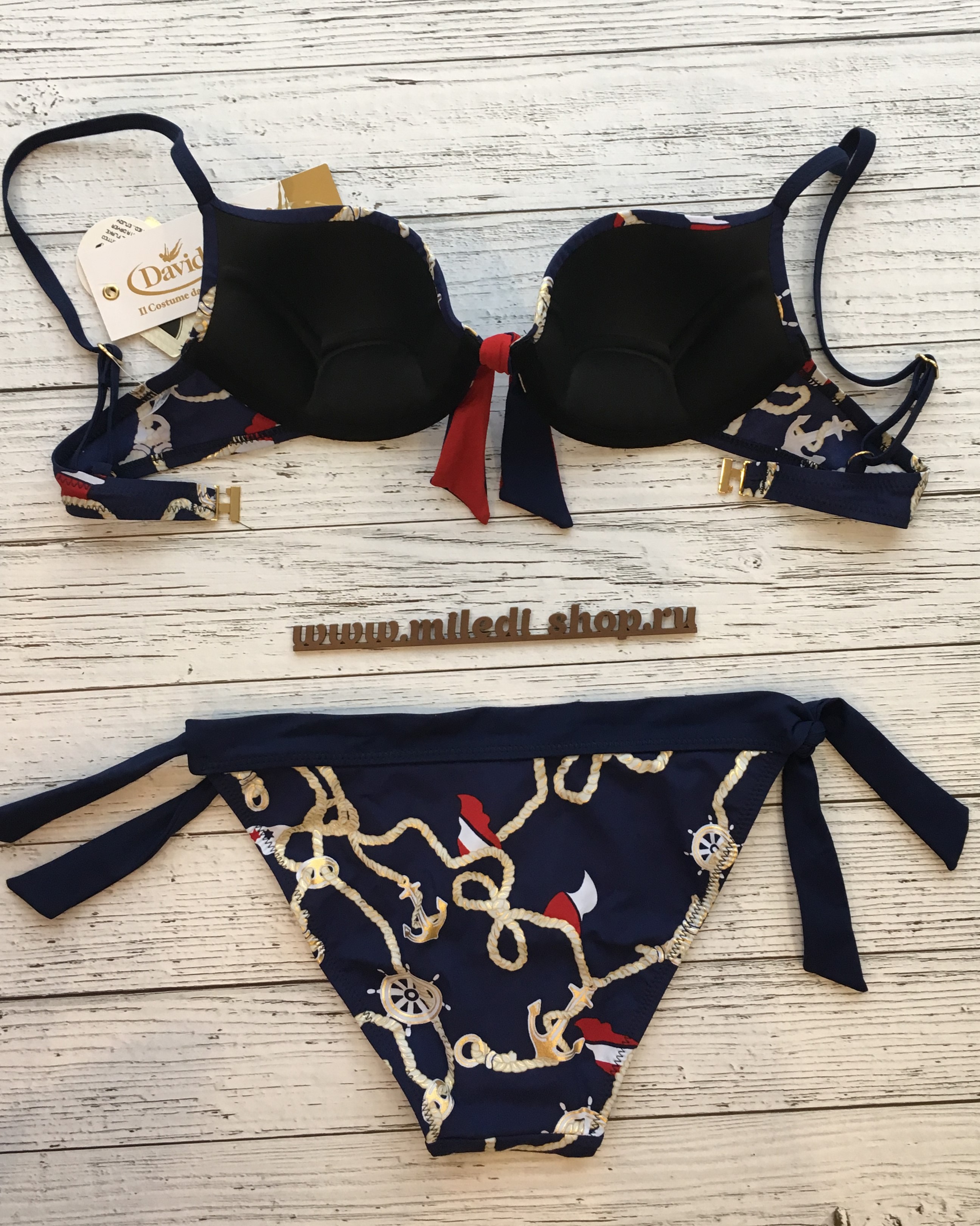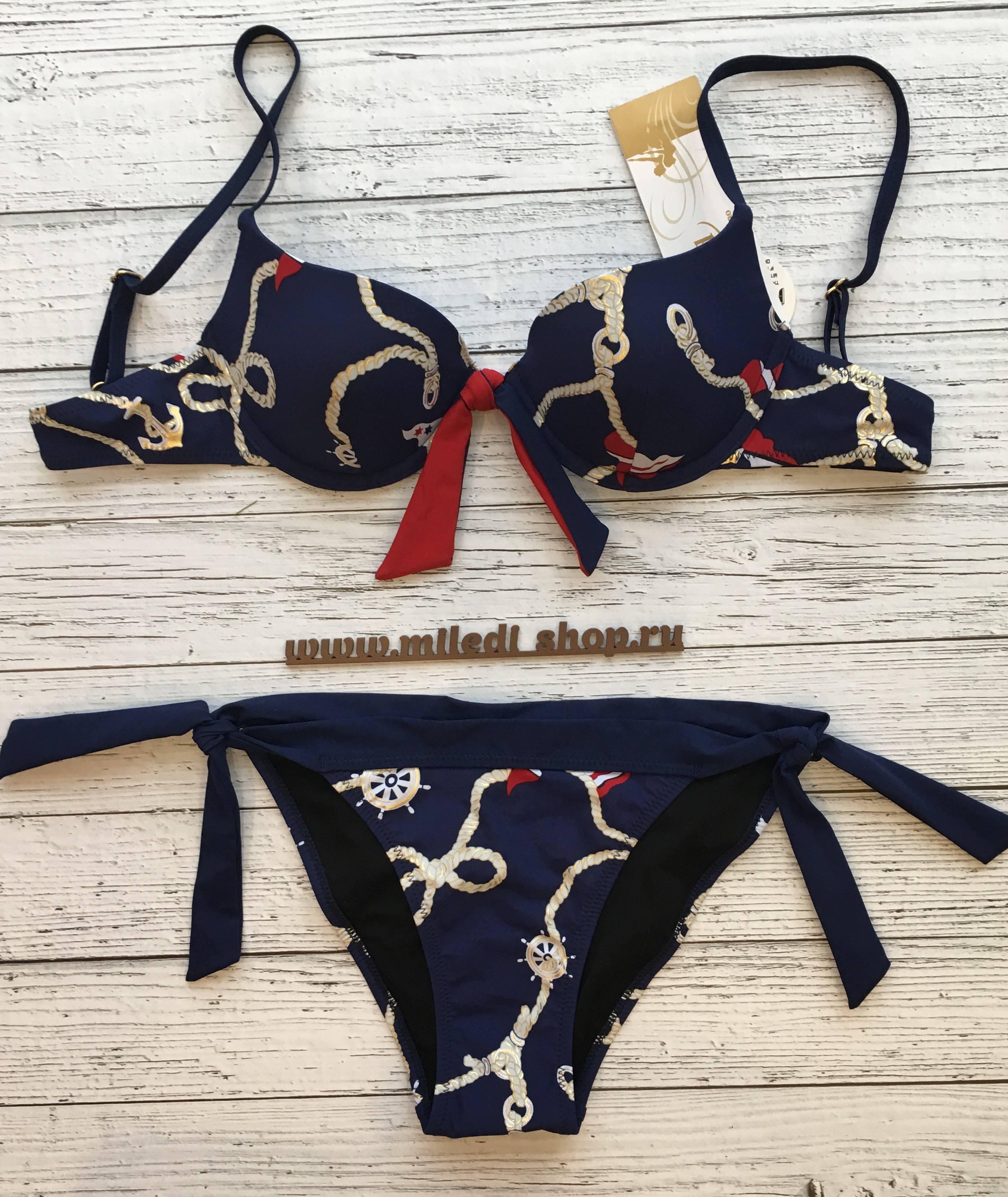 Раздельный купальник: формованная чашка на кости, встроенный эффект пуш-ап, на спине на застежке, бретели регулируемые. Плавки танга на широких завязках. Принт - якоря.