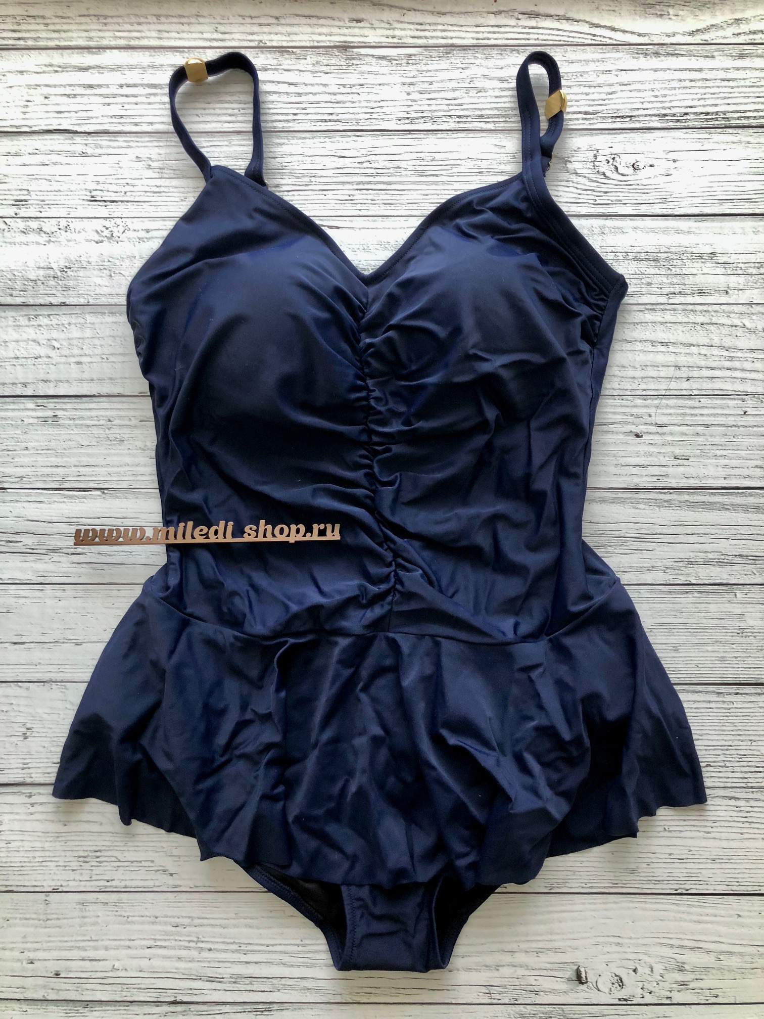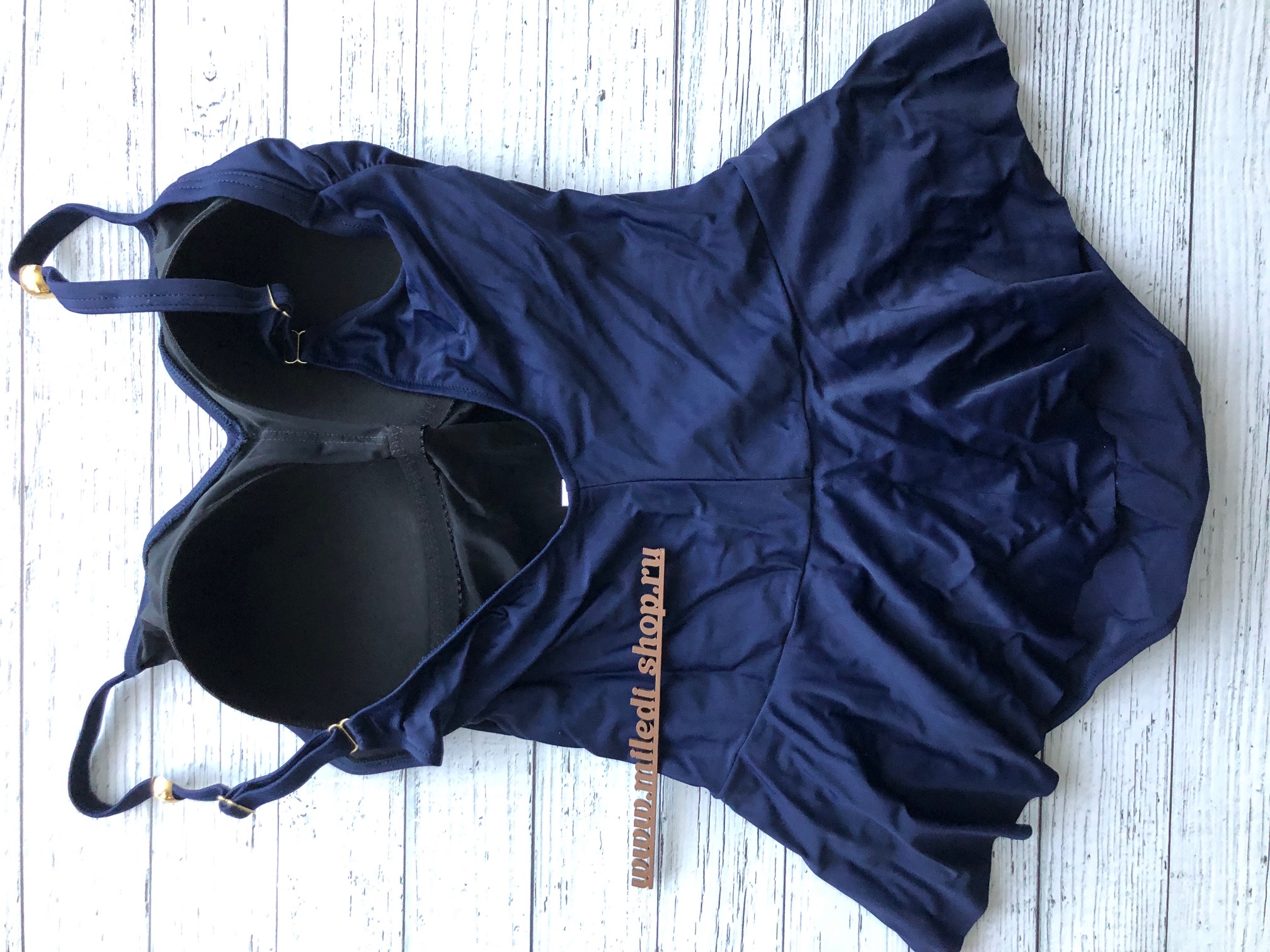 Слитный купальник с уплотненной чашкой без кости, под грудью поддерживающая резинка, широкие несъемные бретели регулируются по длине, спина открытая, с юбкой. Посадка по поле максимально закрытая.