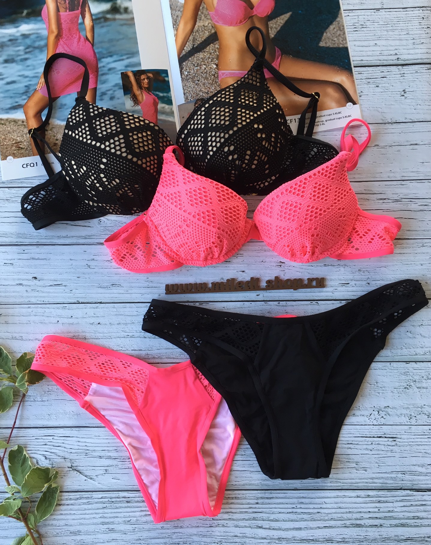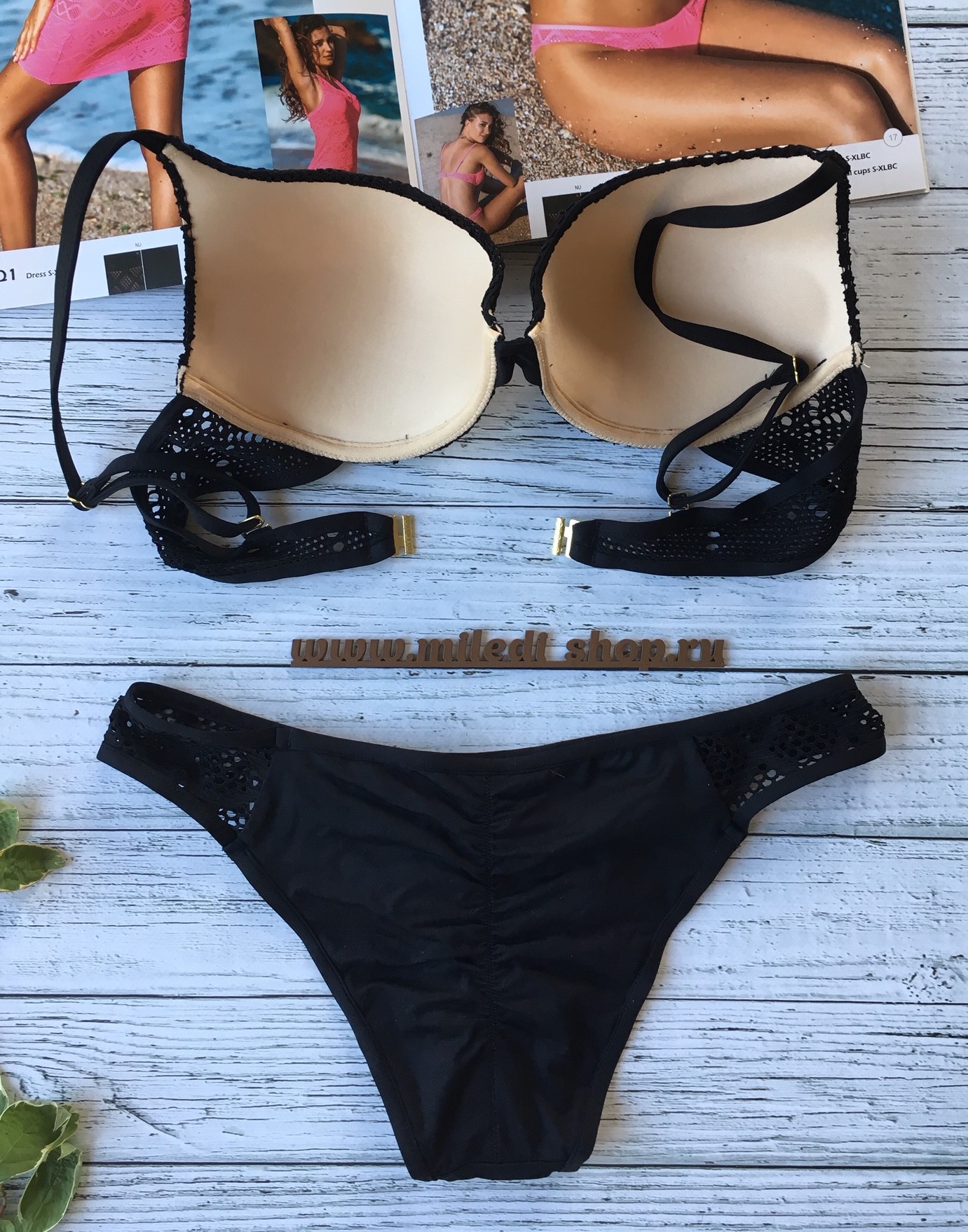 Раздельный купальник с кружевом: чашка уплотненная на кости с пуш-ап, бретели тонкие, регулируемые, съемные, на спине на застежке. Плавки бразилиано с сжаткой и кружевными прозрачными вставками.