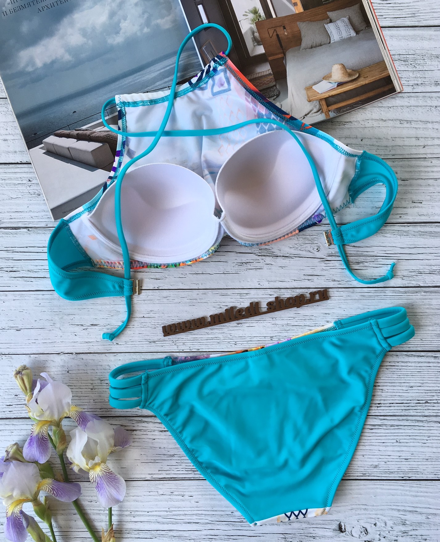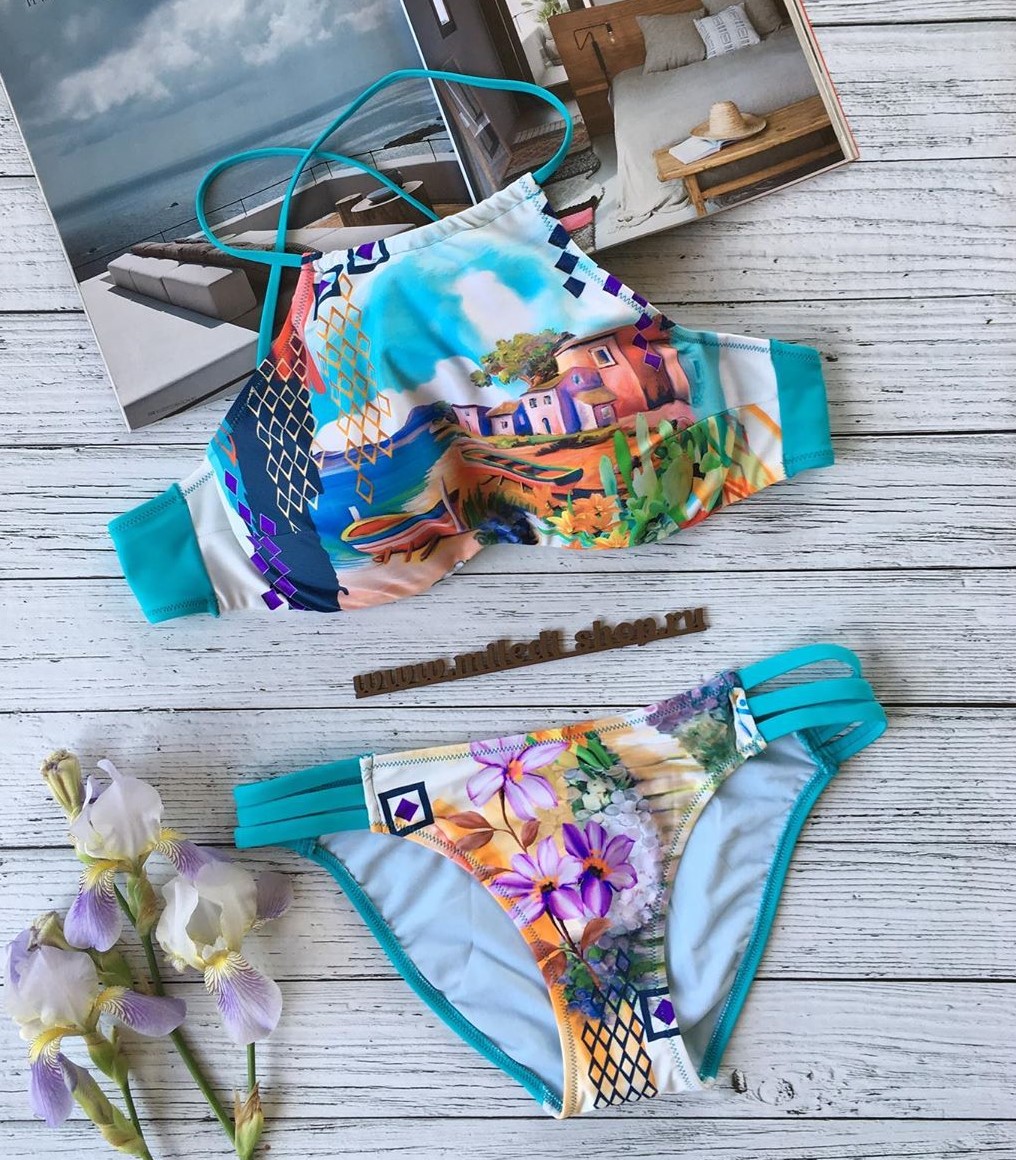 Раздельный купальник: топ-халтер с формованной чашкой на кости (форма анжелика) cо встроенным push-up гель, на спине на застежке, бретели через шею с регулировкой. Чашка B/C. Плавки слипы комфортной посадки. Красивый принт - город.