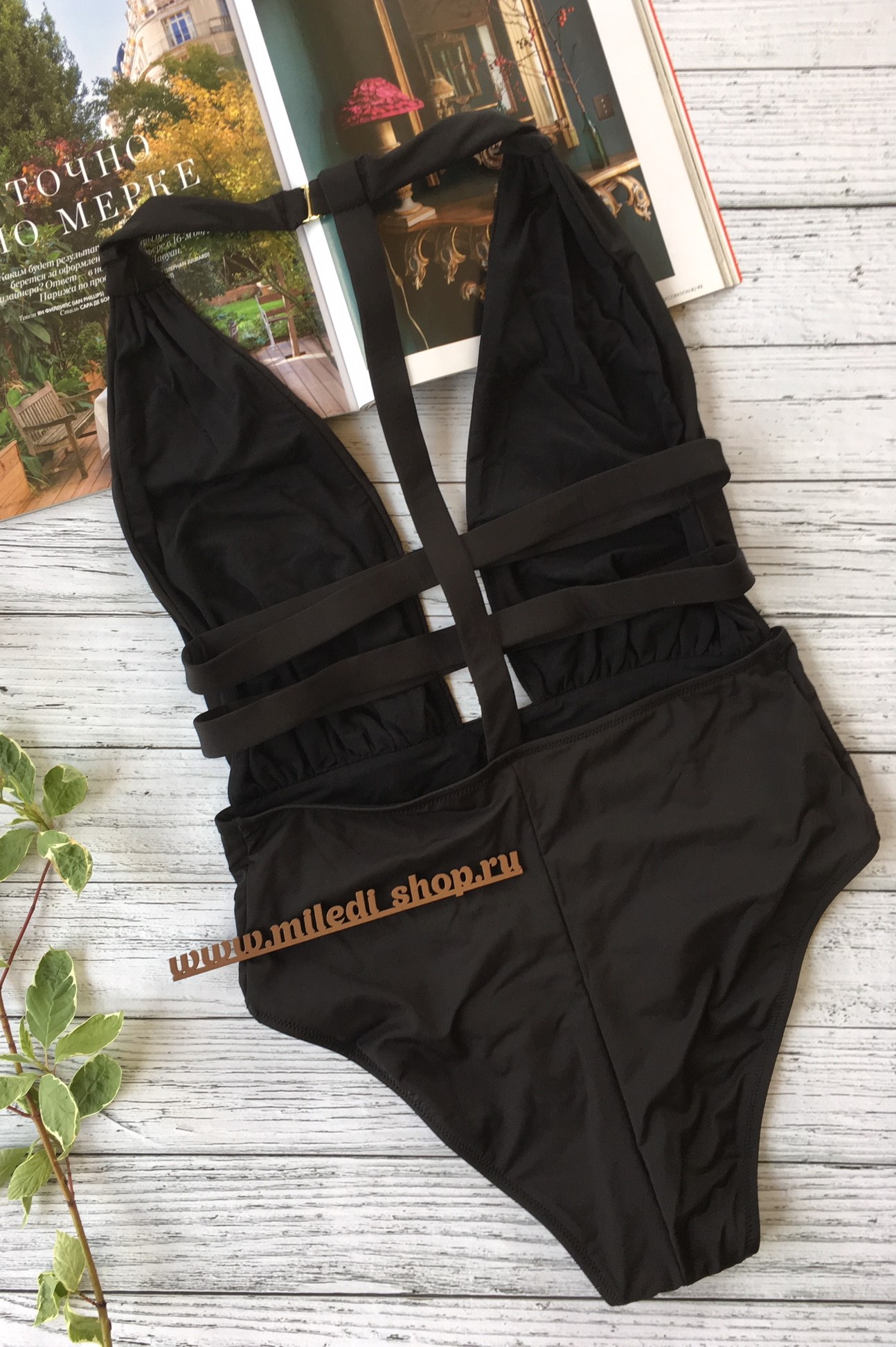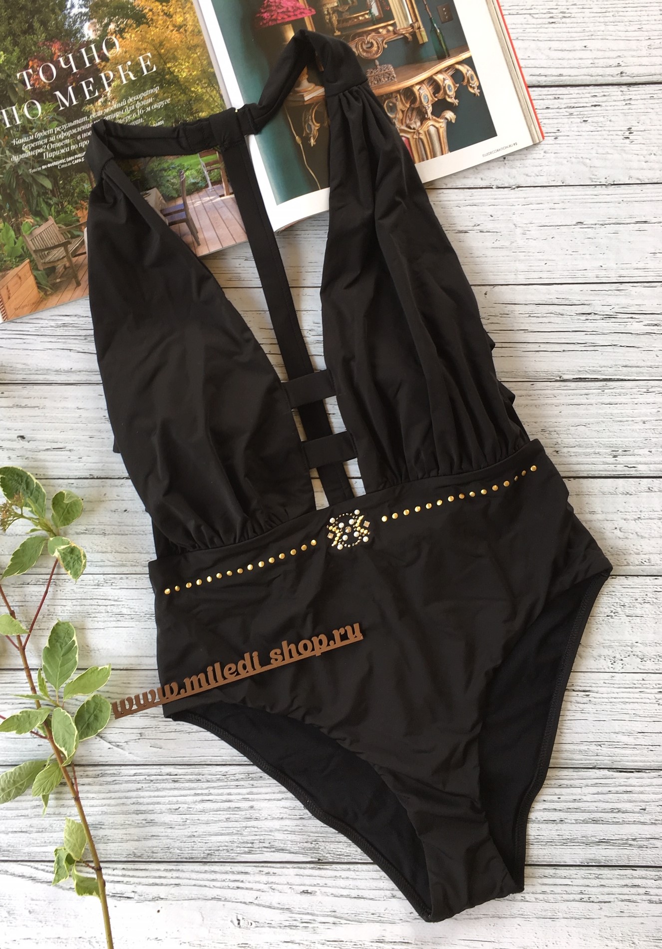 Стильный совместный купальник: мягкая чашка сплошной полоской, завязки через шею (на застежке), глубокий V-образный вырез, эффектная отделка спины, спина открытая. Декорирован стразами. Подойдет на невысокий и средний рост. Чашка B/C.
