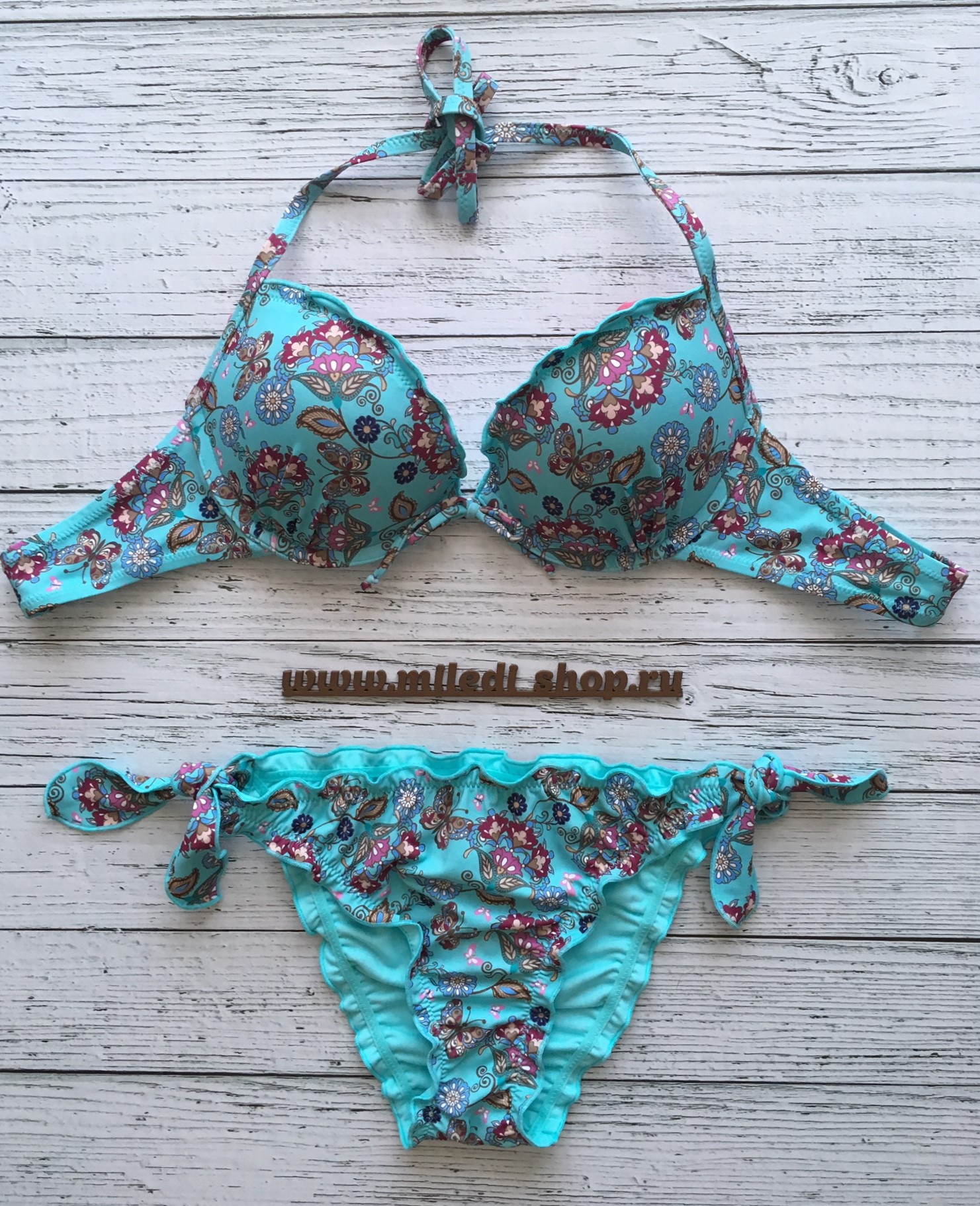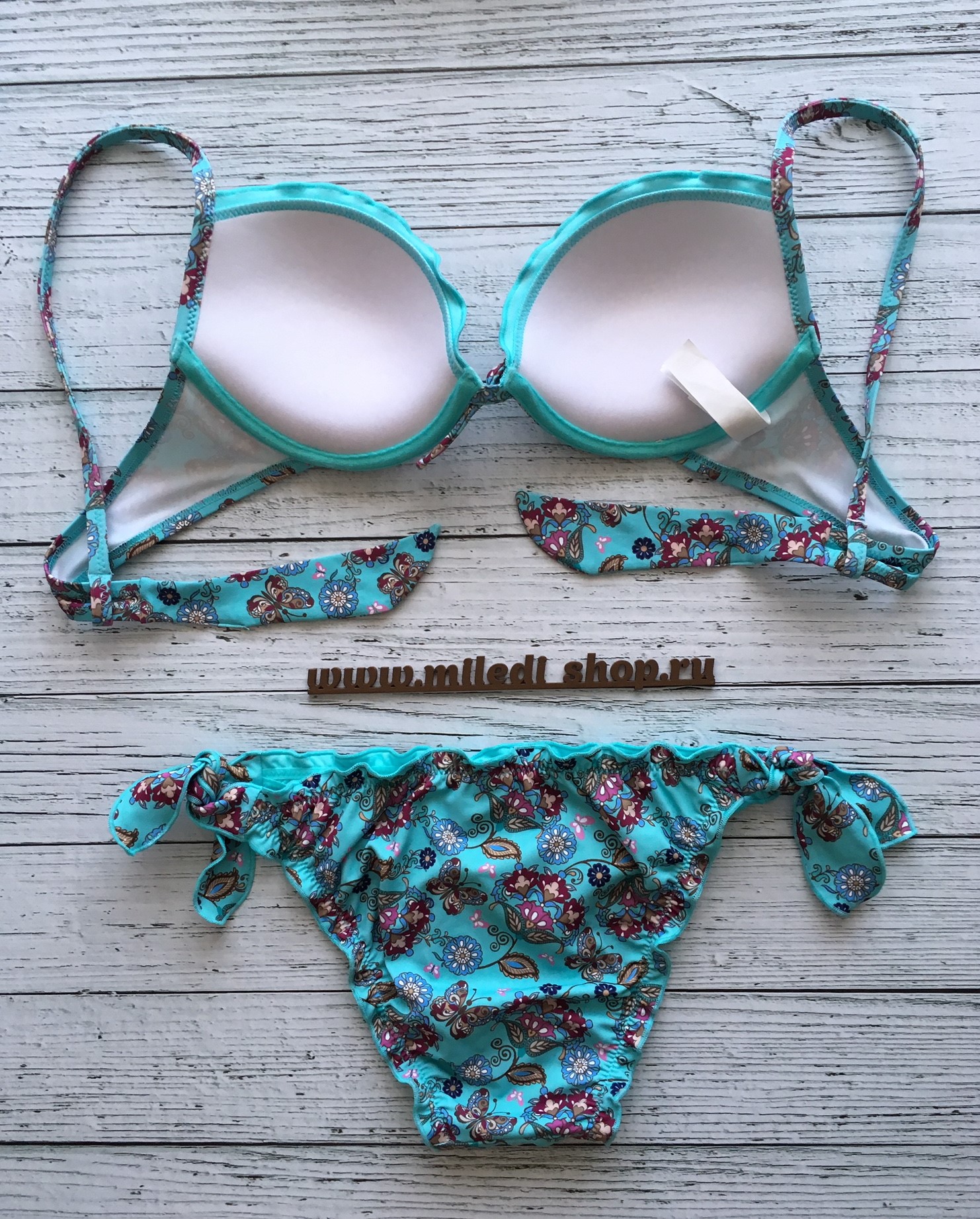 Раздельный купальник с формованными чашечками пуш-ап на кости, сзади на завязках, бретельки съемные, нерегулируемые, можно завязать через шею. Плавки слипы с оборками на завязках.
