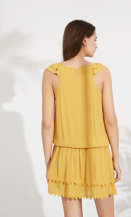 Пляжная туника без рукавов, отделка кружевом. На спине застежка, талия присобрана.